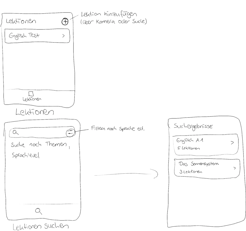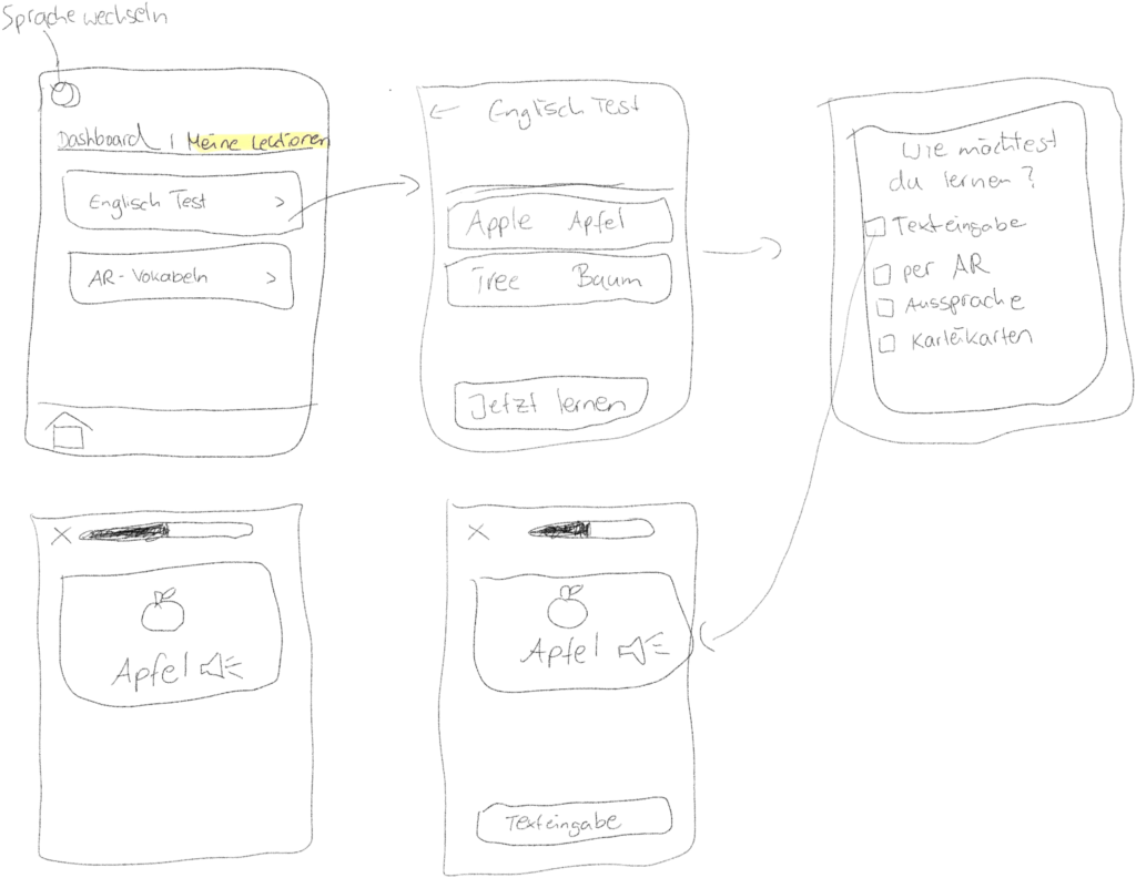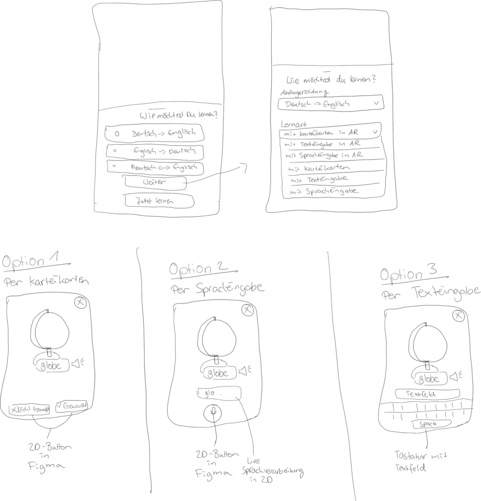 Nachdem eine Liste an möglichen Funktionen für „VocabulAR“ angefertigt war, wurden erste Funktionen in Form von einfachen Skizzen auf dem iPad digital umgesetzt.