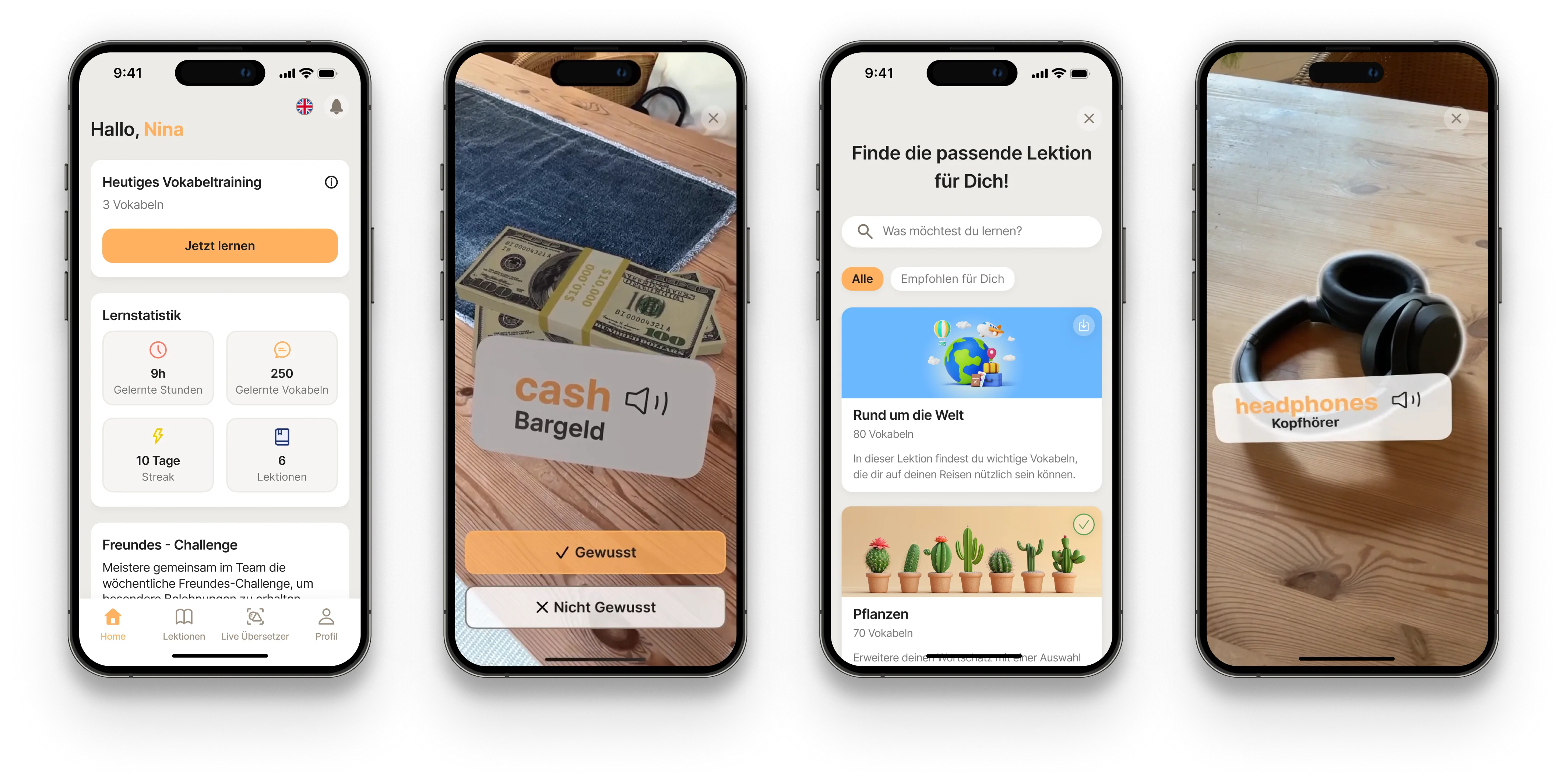 Das Ziel war die Entwicklung einer Vokabellern-App, die Augmented Reality (AR) nutzt, um den Fremdsprachenerwerb zu unterstützen. Der Fokus lag dabei auf der Konzeption und dem Design der App, daher wurde das Lernen in AR nur simuliert.